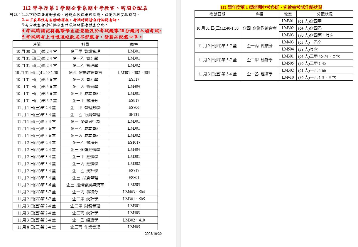 【學士班】112學年度第1學期期中考試時間分配表